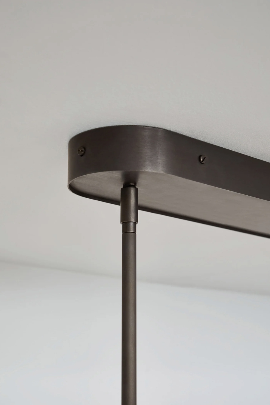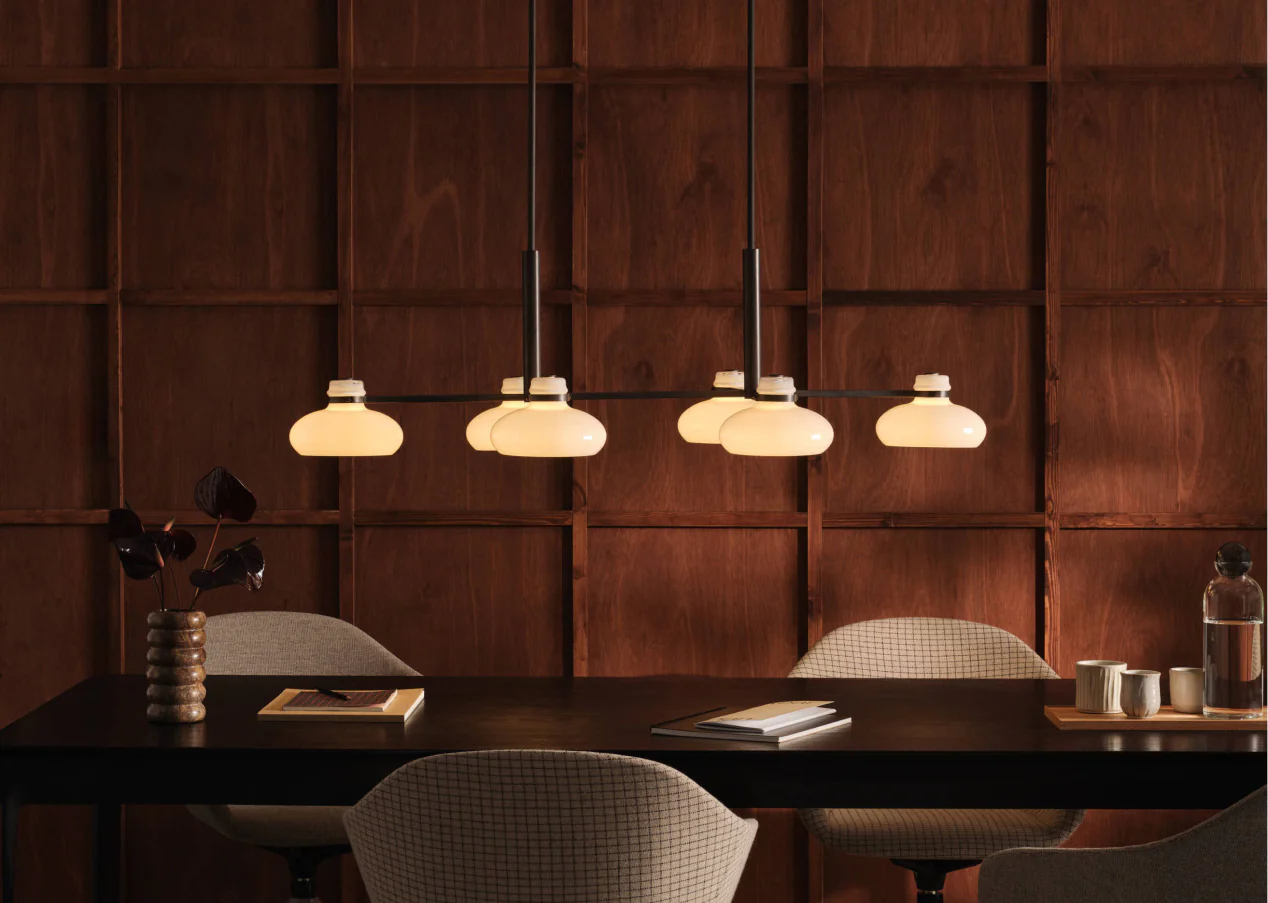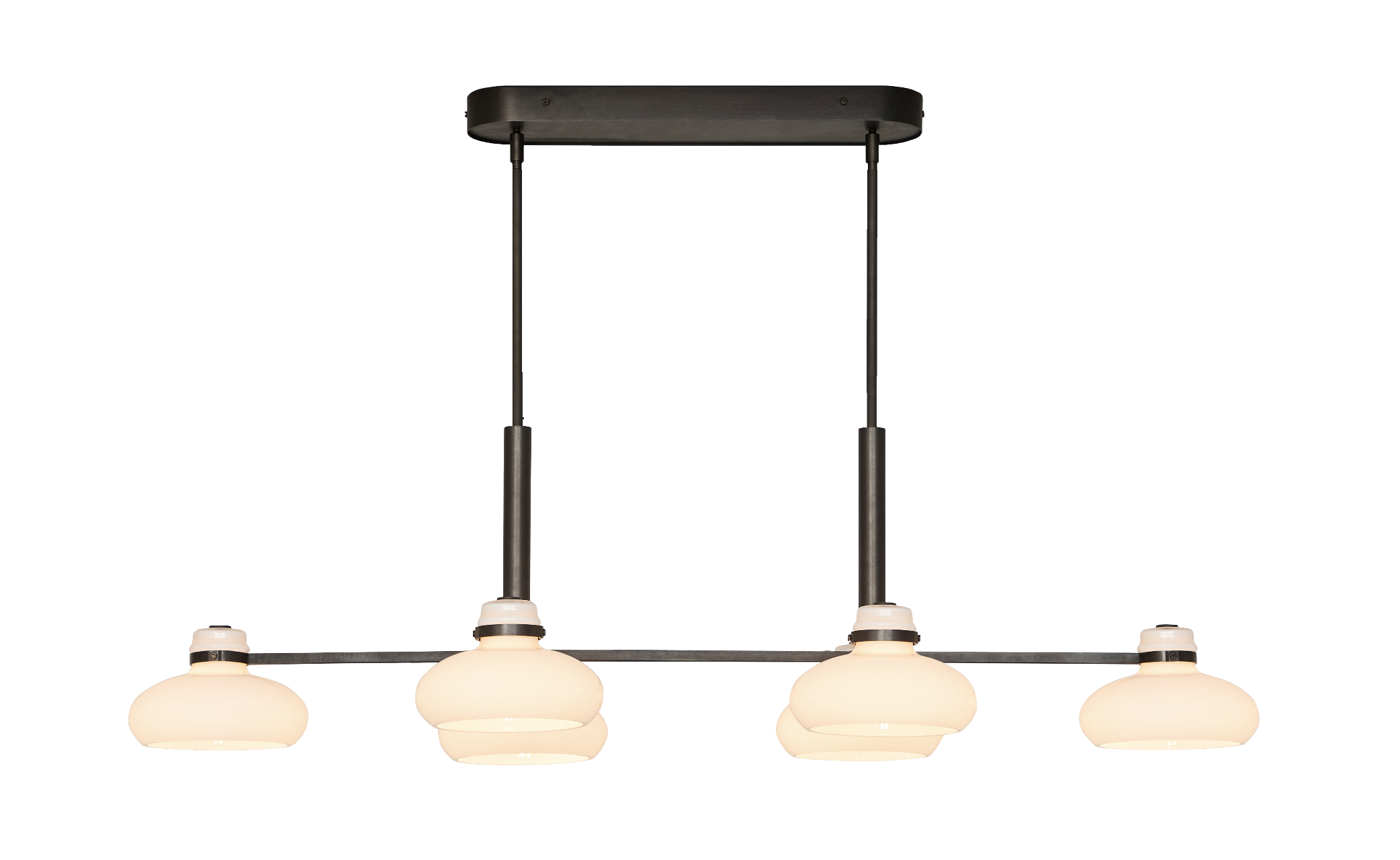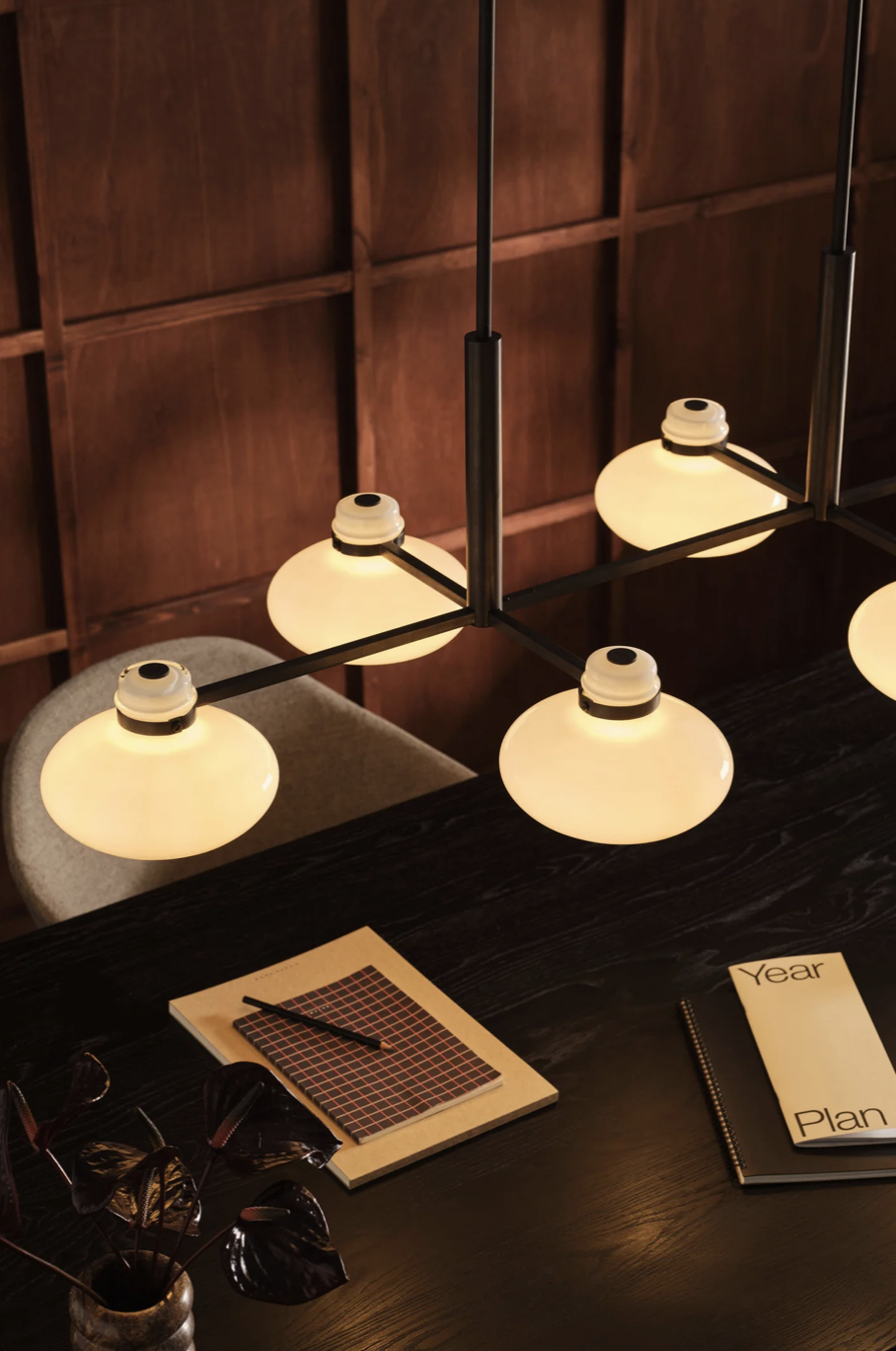 Elegant pendel med opalhvide glasskærme og sortbruneret metalramme. Giver et godt, direkte lys og skaber samtidig en varm og hyggelig stemning i rummet.