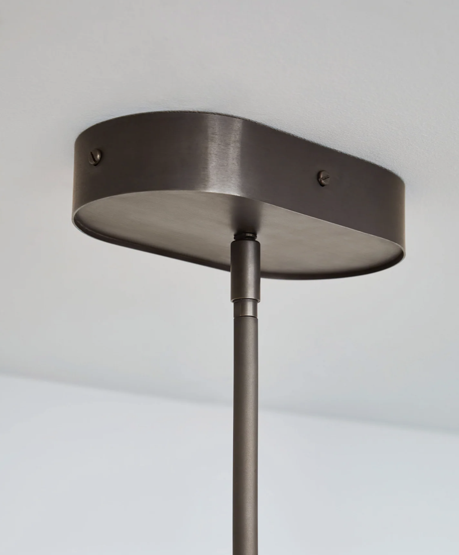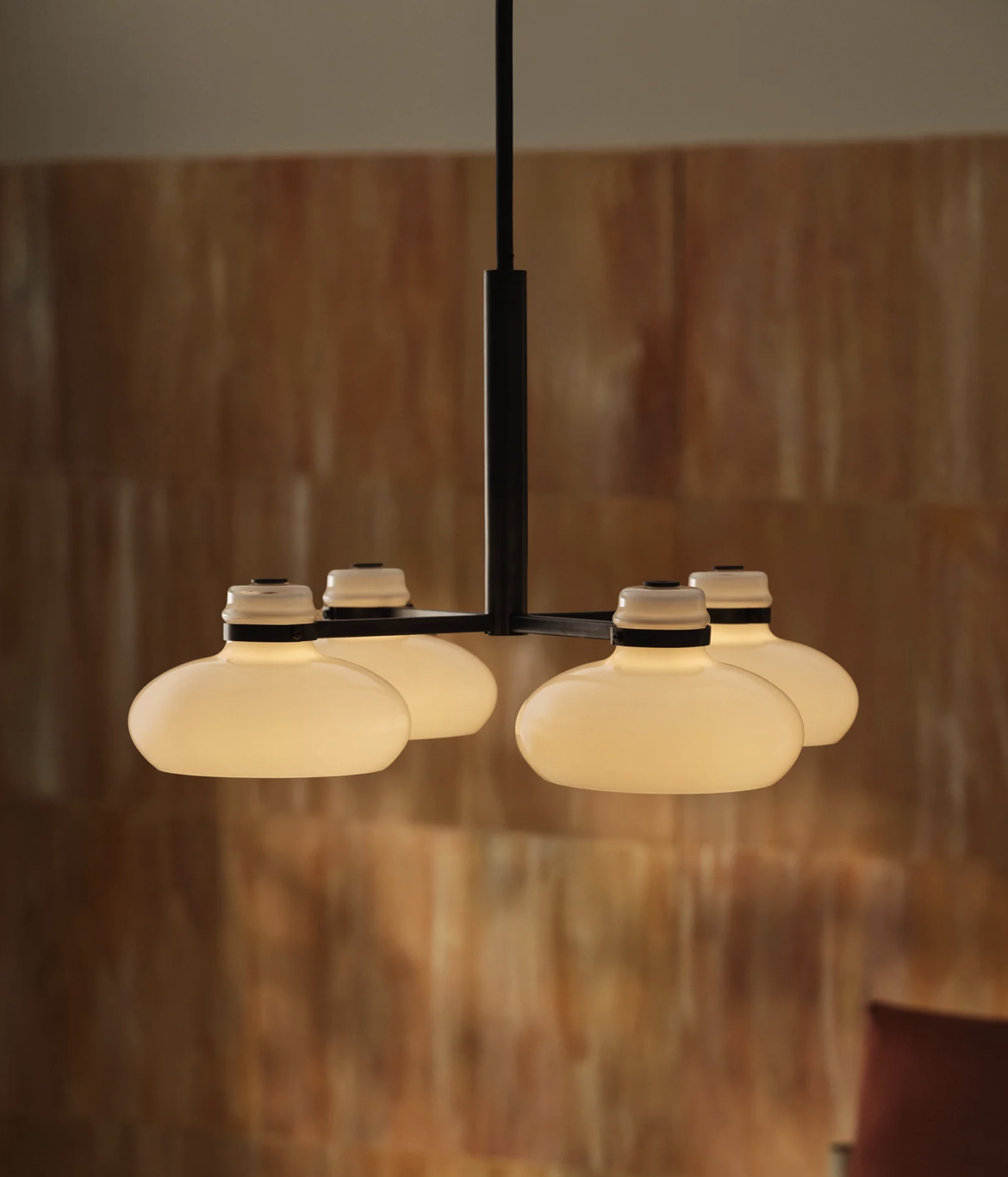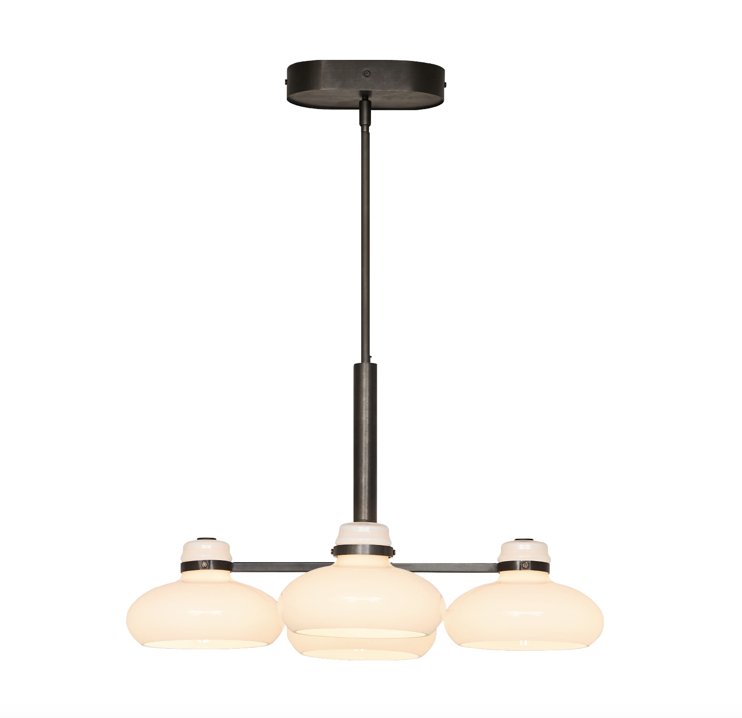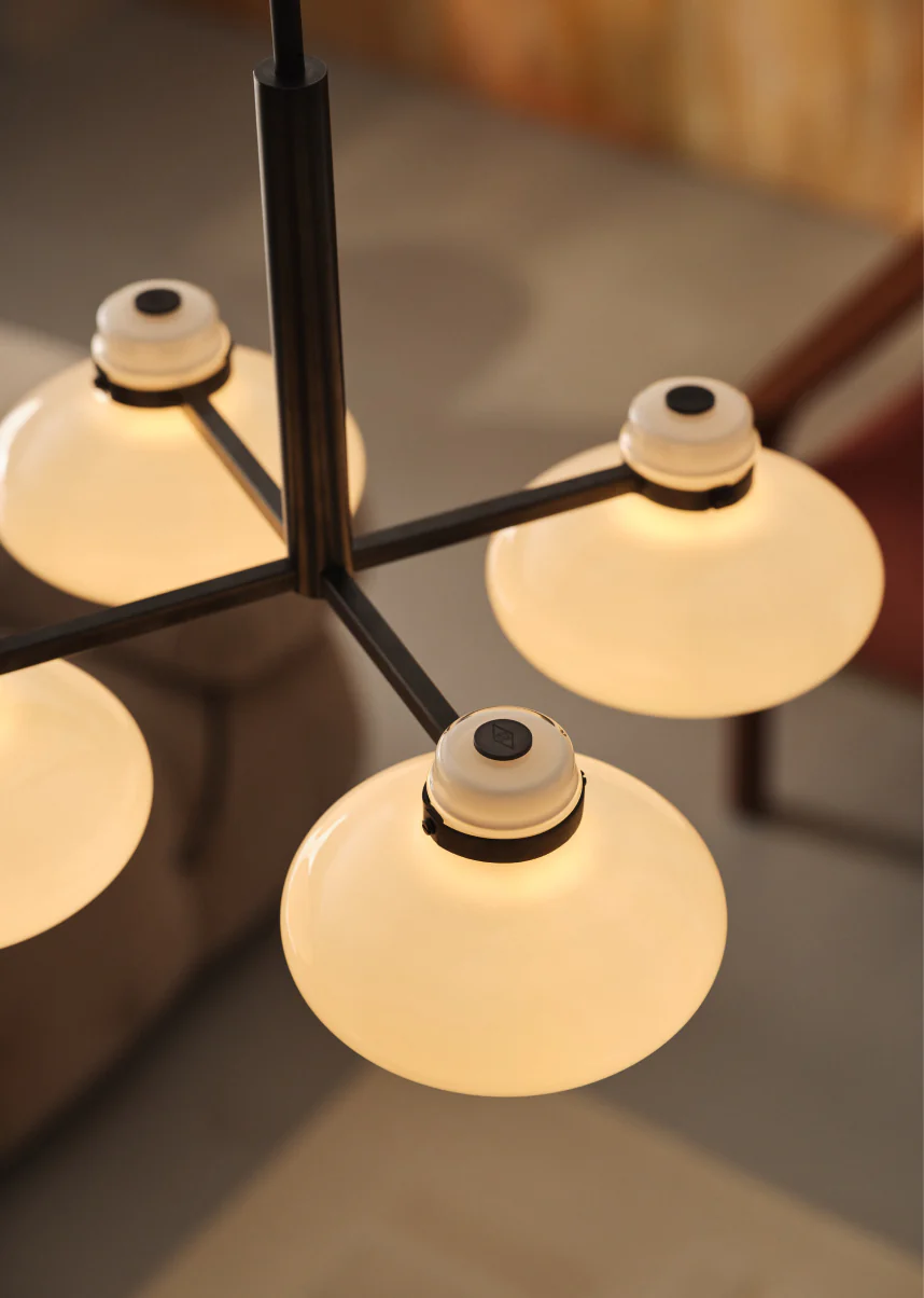 Elegant pendel med opalhvide glasskærme og sortbruneret metalramme. Giver et godt, direkte lys og skaber samtidig en varm og hyggelig stemning i rummet.