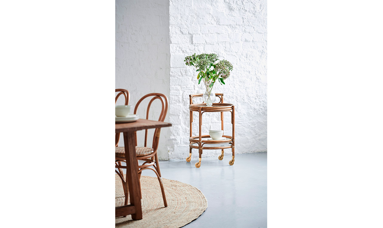 Romeo trolley er lavet af indonesisk bæredygtig rattan. Vores trolley er udført i farven antik, som er hyggelig og passer til alle træsorter. Bordet består af håndlavede viklinger på et stel af rattan udført af dygtige kurvemagere.