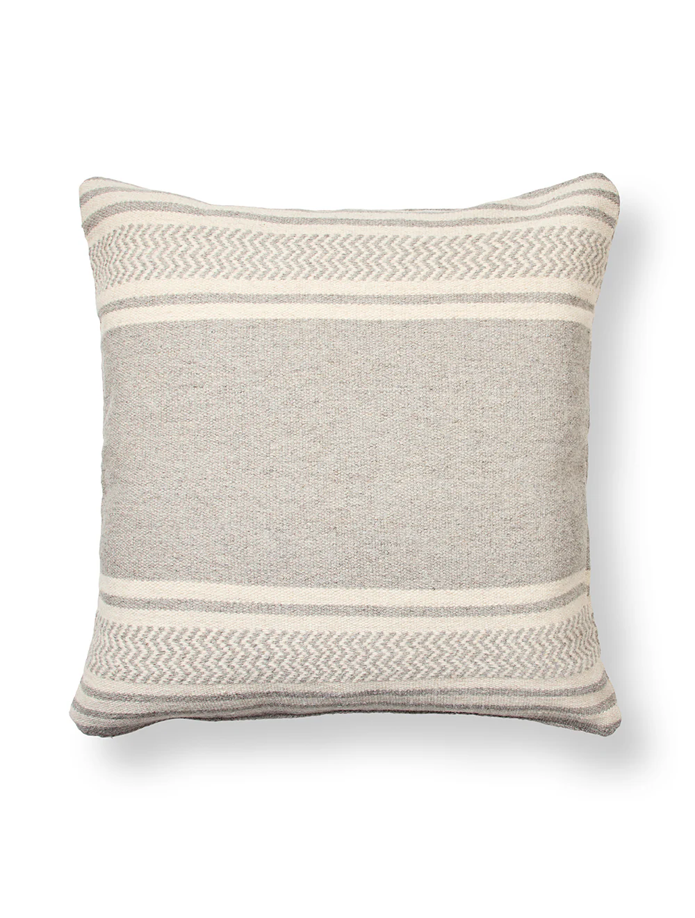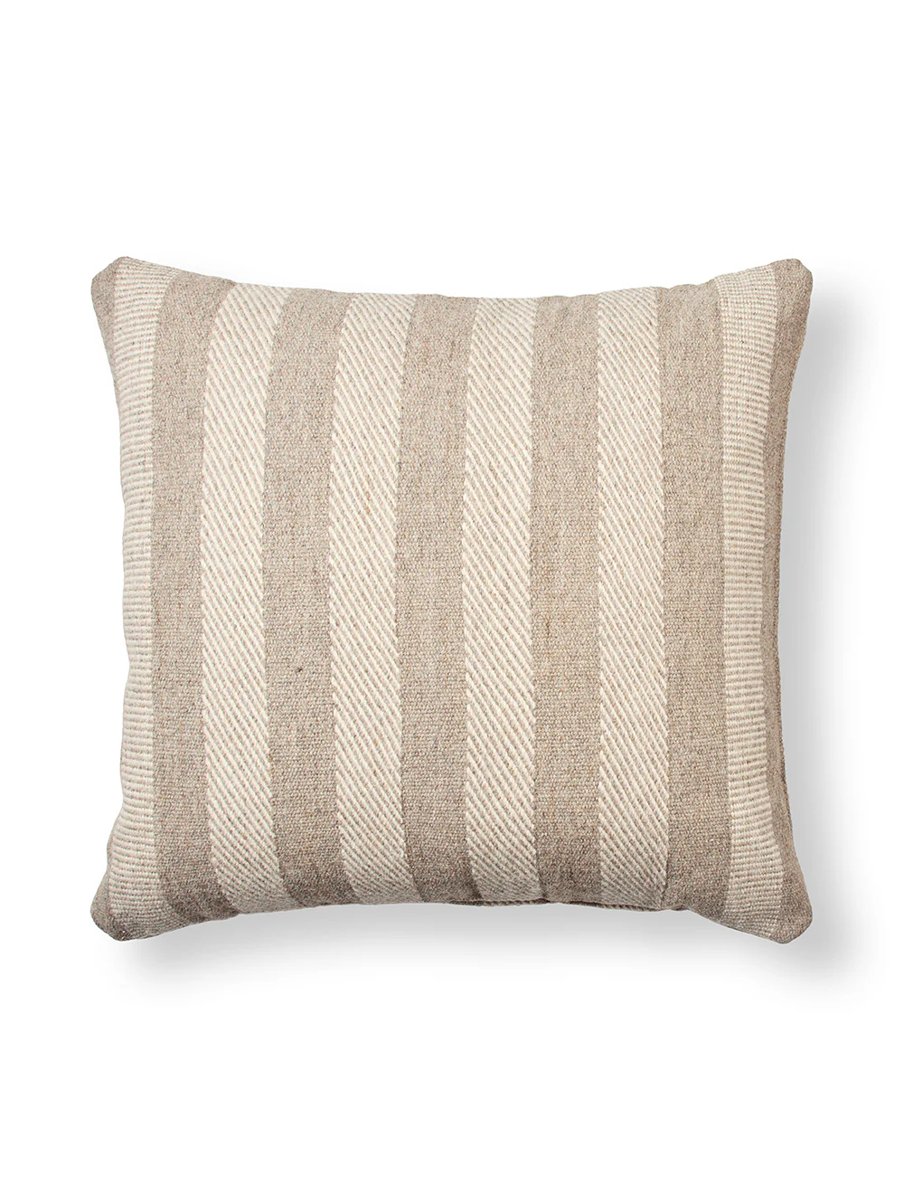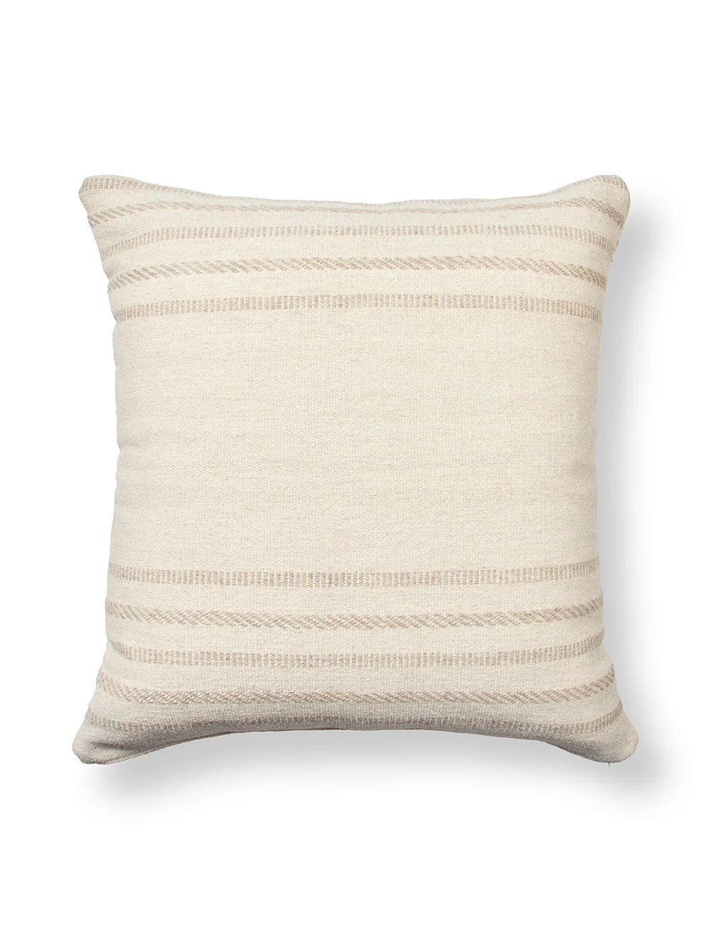 Kelim puderne er skabt til både afslapning og hverdag. Designet i København og håndsyet i Karur af håndfarvede tråde. Fladvævet 100 % uld med bomuldsfyld giver en blød og holdbar kvalitet med et roligt udtryk.