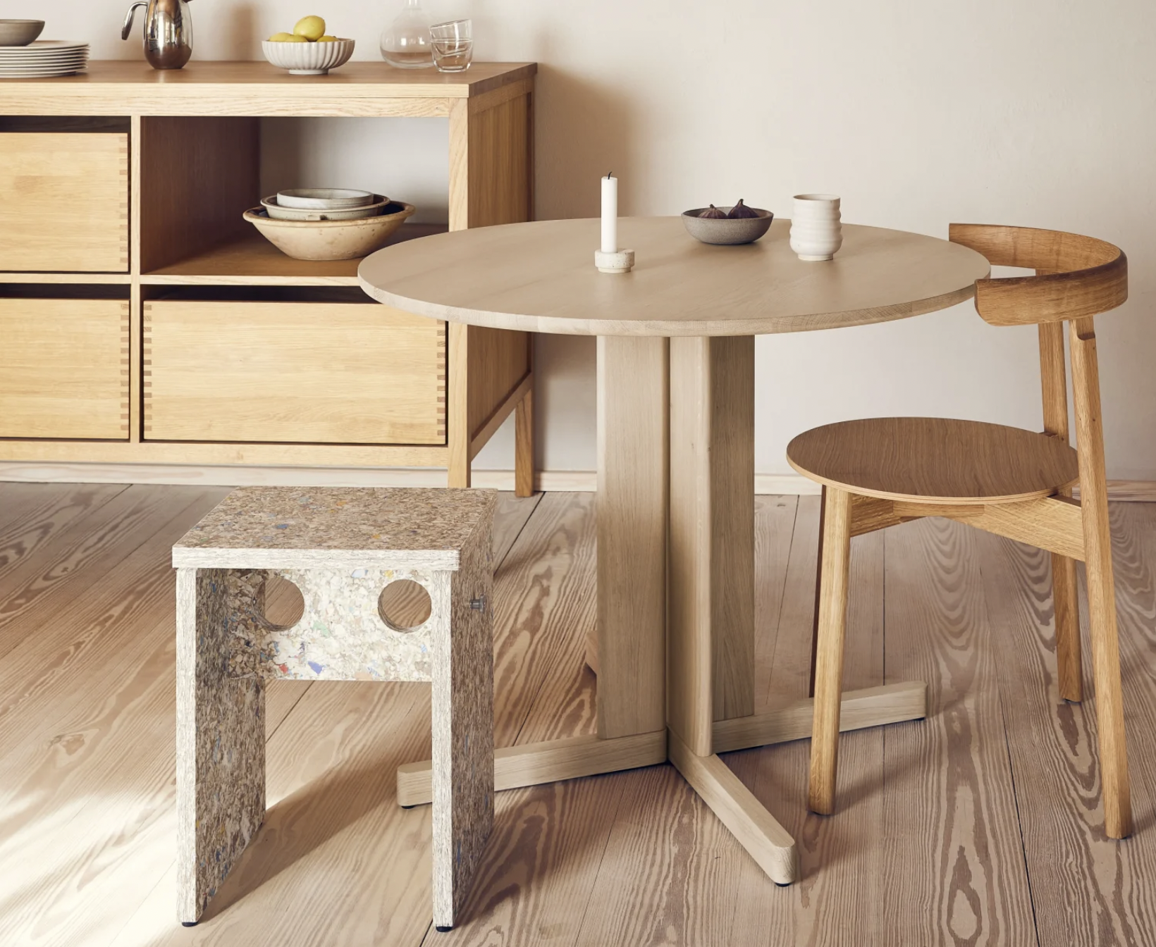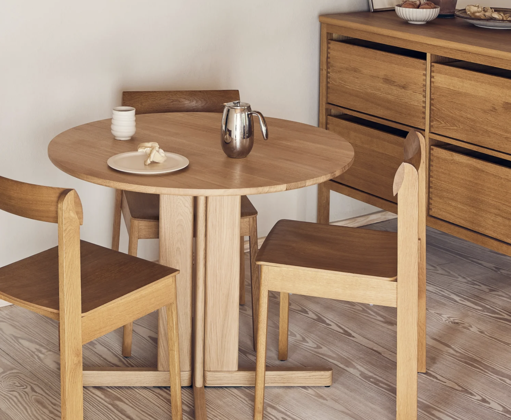 'Trefoil' spisebord fra danske Form&Refine. Der er bare noget helt særligt over et rundt spisebord. Spisebordet er i olieret egetræ med en smuk overflade. Bordet er ikke særligt stort, og er derfor perfekt i et køkken eller en lille stue hvor pladsen er trang.