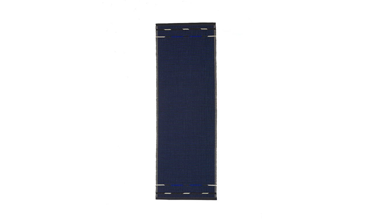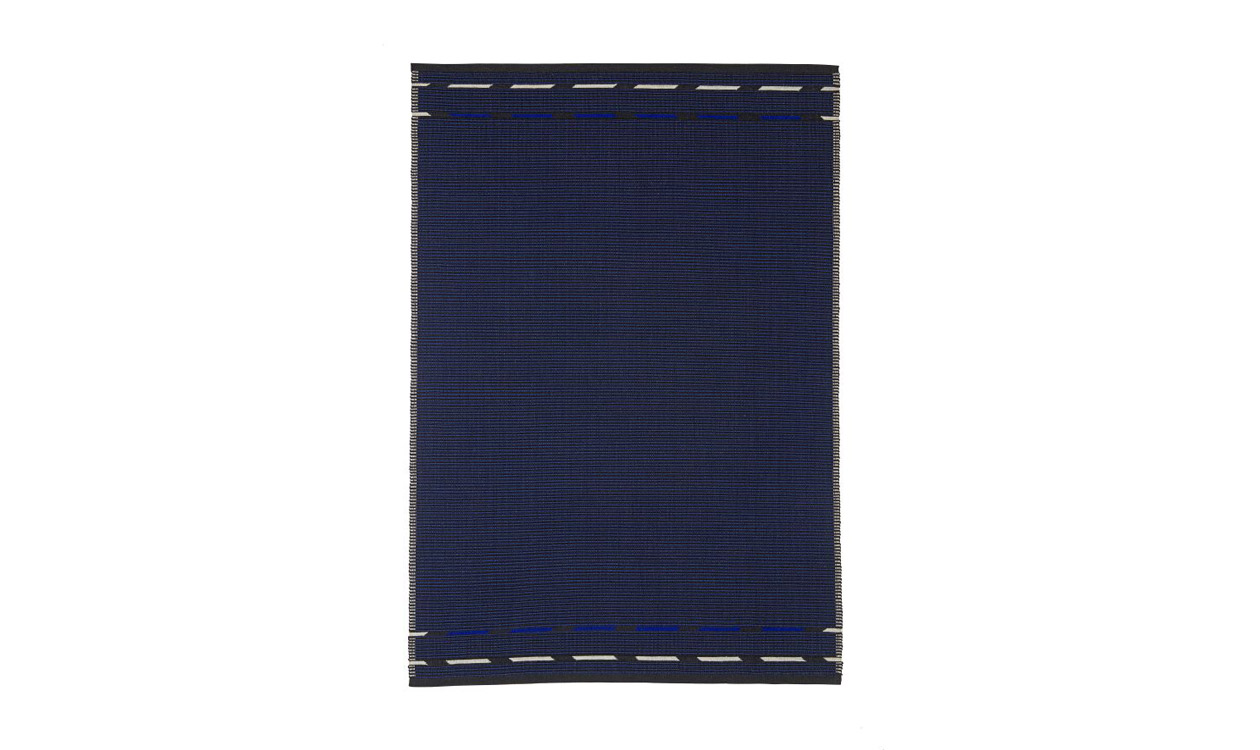 Tæppet fås i blå/sort bund med ”lynilds” detaljer i sort, hvid og ultramarin blå samt en 3 cm synlig ombukket afslutning.