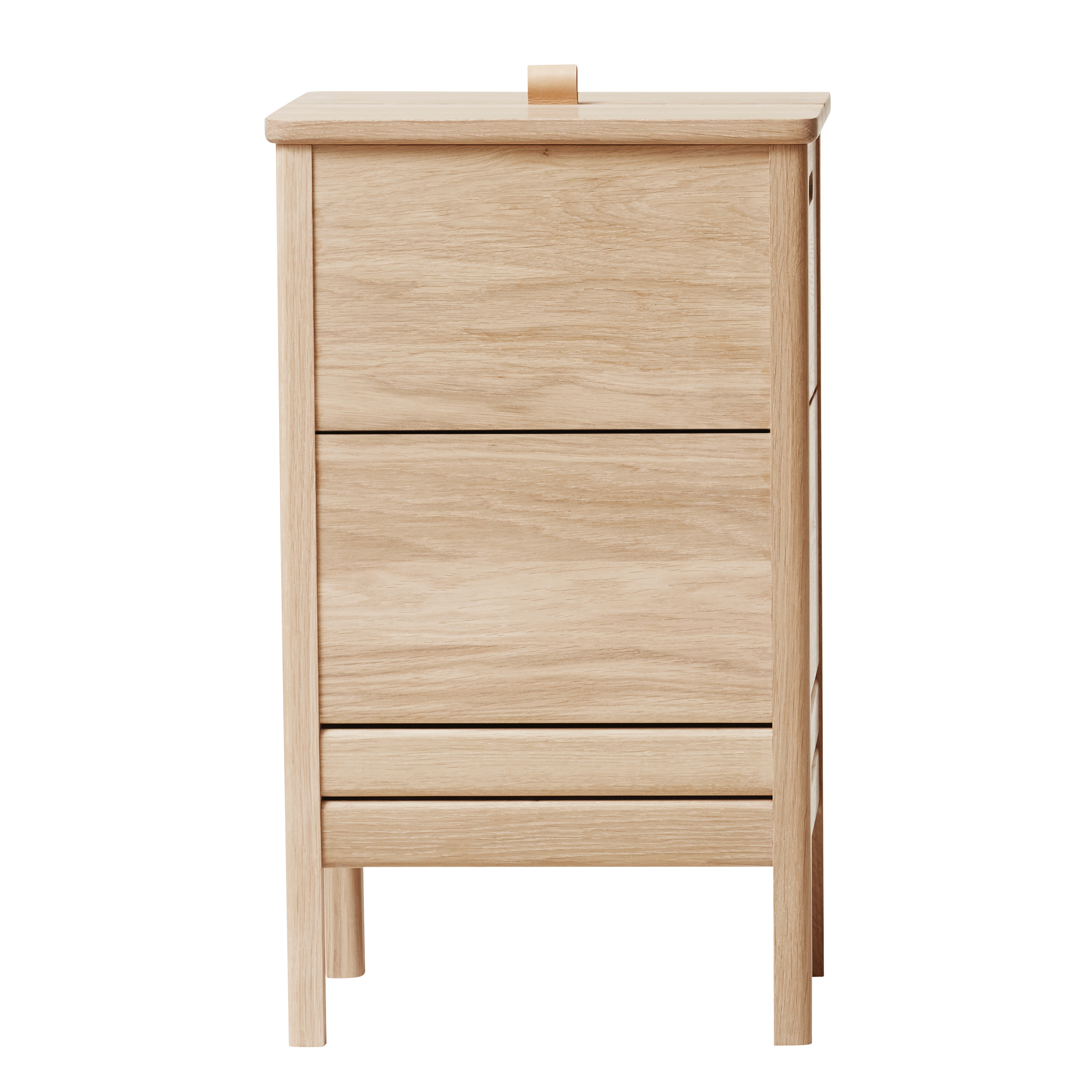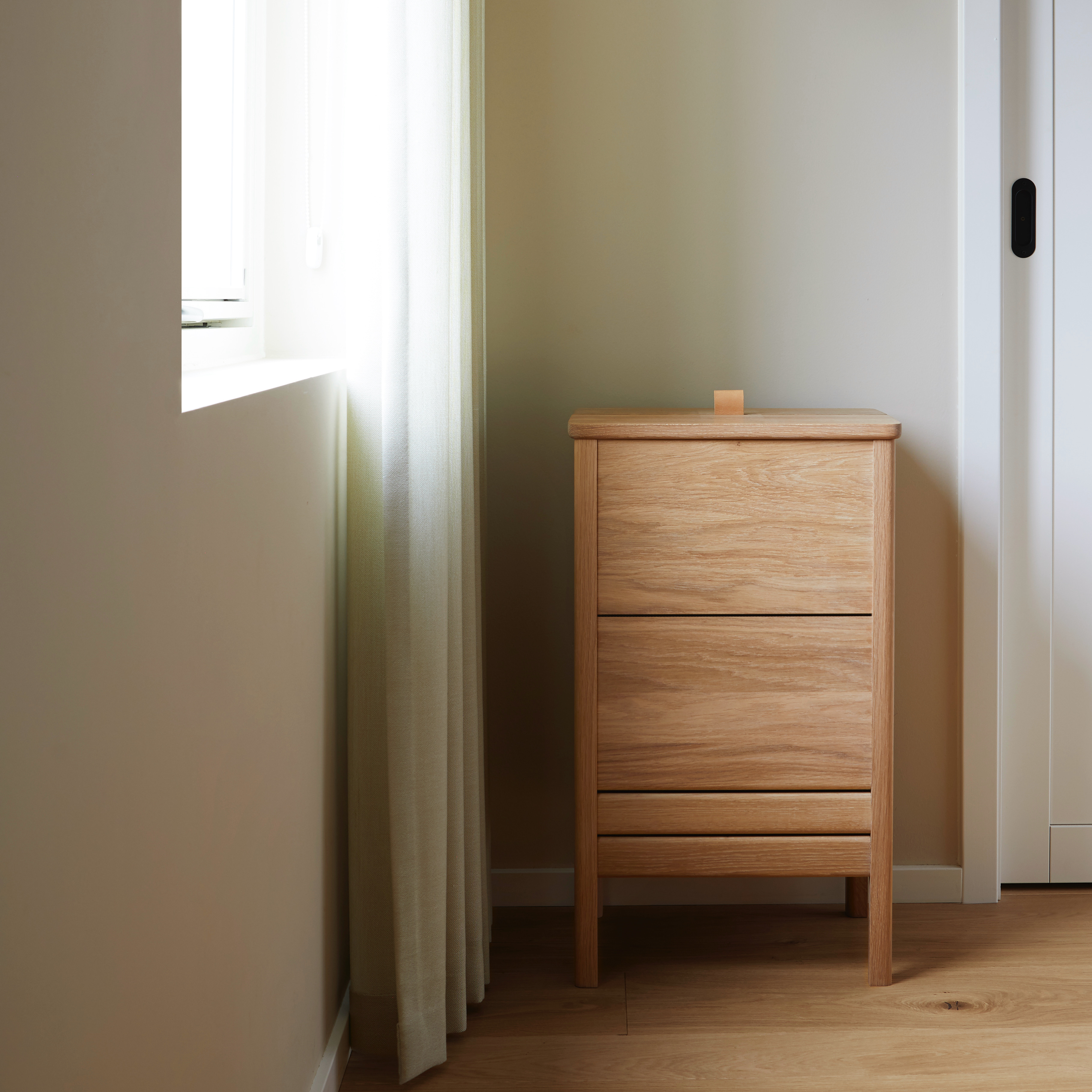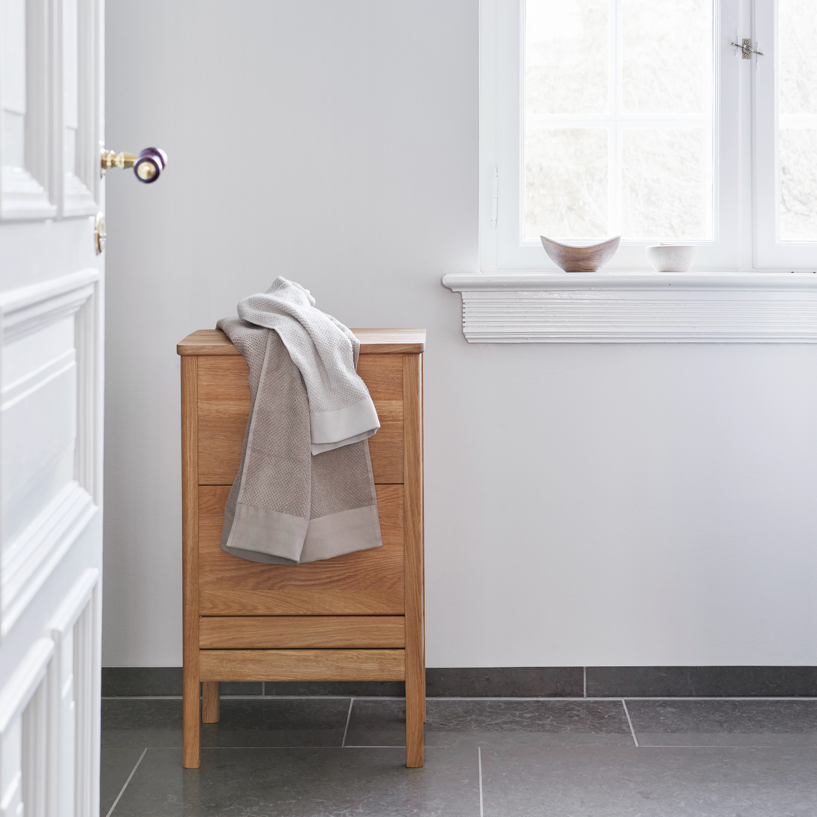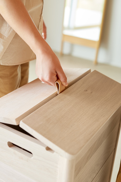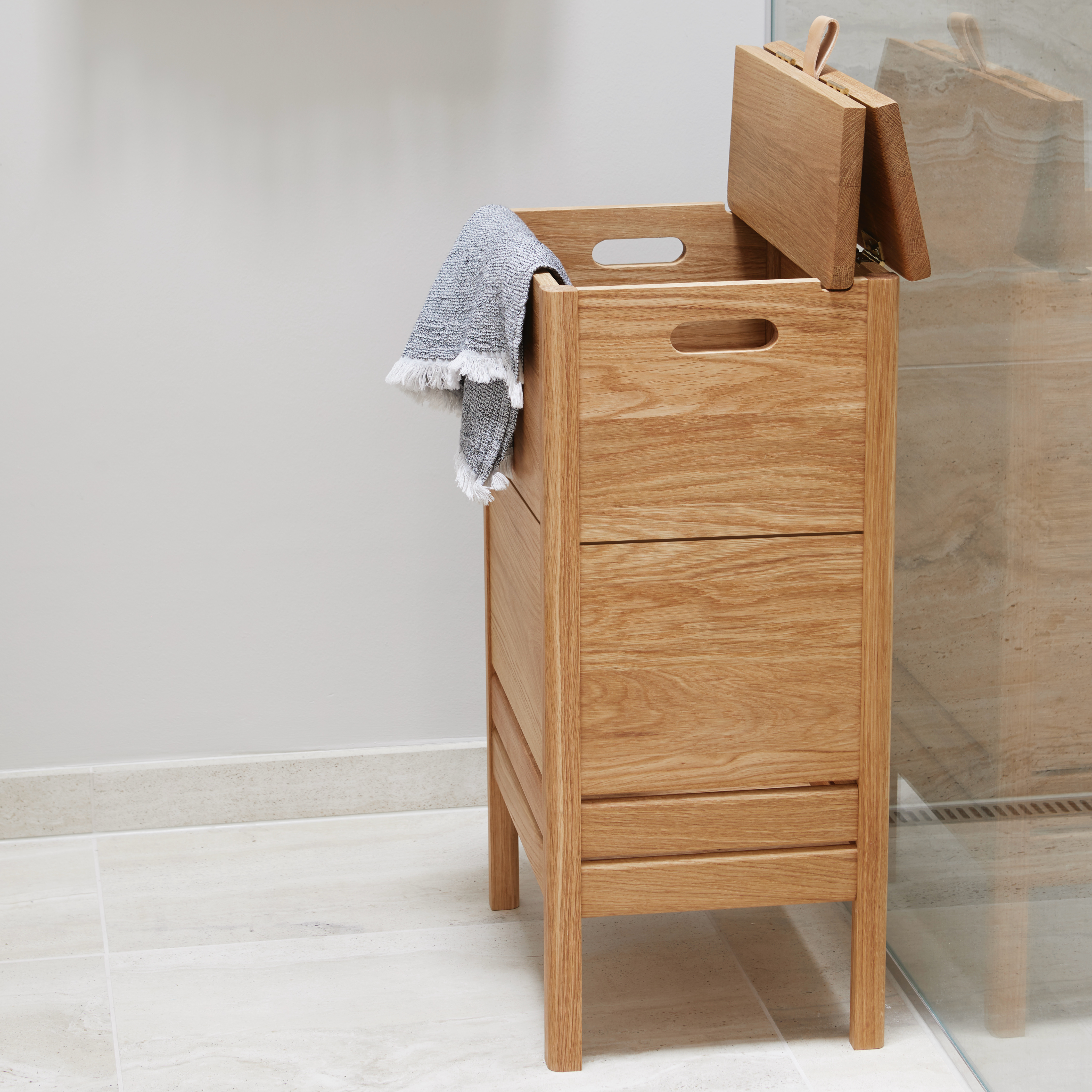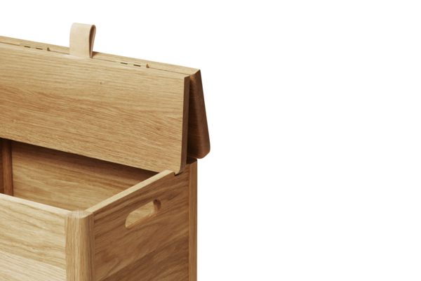 A Line Laundry Box fra danske Form & Refine. Vasketøjskurven er lavet af massiv europæisk egetræ og med en strop i kernelæder. Der er dermed bestemt ikke sparet på kvaliteten i denne lækre vasketøjsboks, hvilket vægten på 12,5 kg også indikerer. Den er naturolieret, og er derfor behandlet på forhånd. Med tiden kan den behandles med en olie igen, hvis der er behov for det.